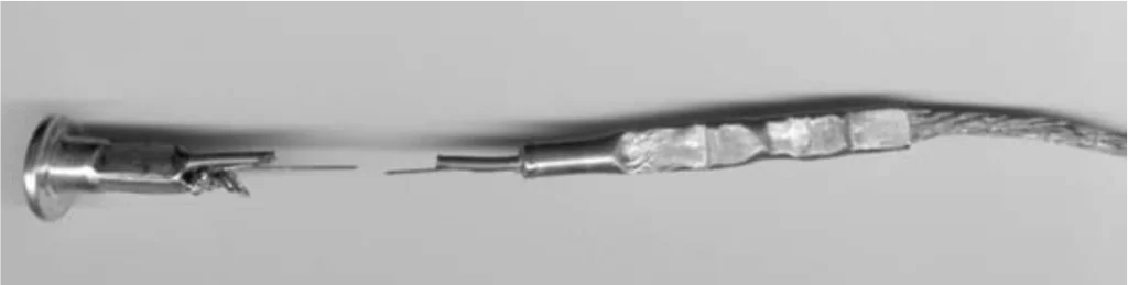 Con este tipo de fallo, el cable de tensión y el elemento fusible se fundirían en algún punto entre la junta y el casquillo de cobre.